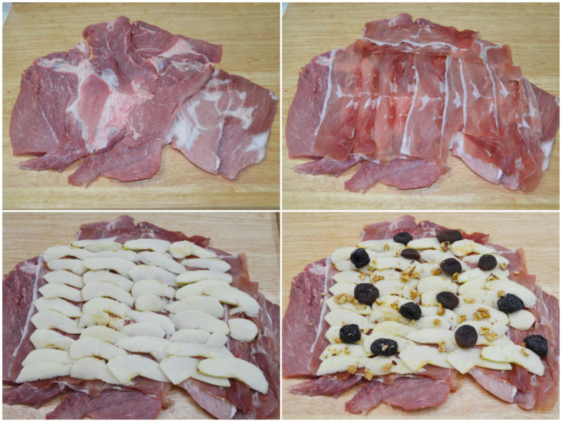 Coprite lo speck con le fettine di mele, quindi aggiungete prugne, albicocche e le noci sminuzzate grossolanamente.