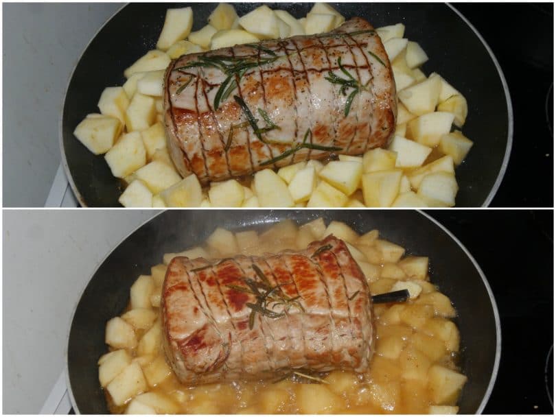 Aggiungere le mele nella casseruola con l'arista, versare il brodo bollente, mettere il coperchio e far cuocere a fuoco medio/basso per 40 minuti circa. Rigirare il pezzo di carne a metà cottura e aggiustare di sale e pepe.