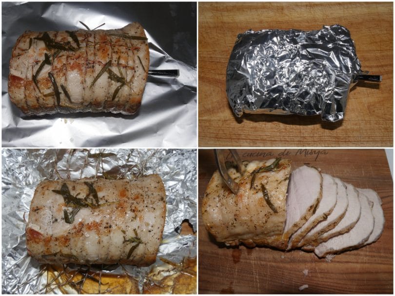 A cottura ultimata, sollevate l'arrosto, poggiatelo su un tagliere, eliminate lo spago e fatelo riposare 5 minuti avvolto con della carta argentata. Poi affettatelo.