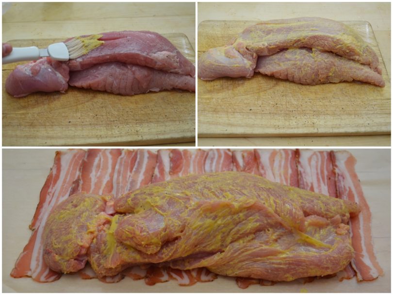 Disponete le fette di pancetta su un foglio di carta forno, sovrapponendole leggermente tra loro, e poggiateci su il tacchino.