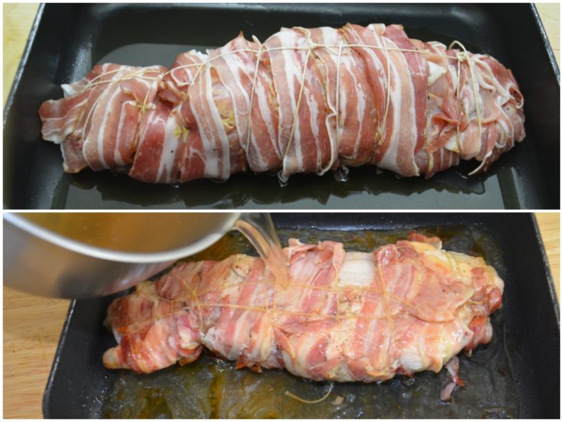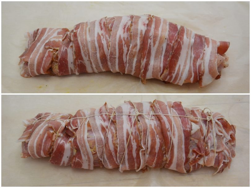 Avvolgete la carne con la pancetta aiutandovi se serve con la carta forno, quindi legatela bene con lo spago.