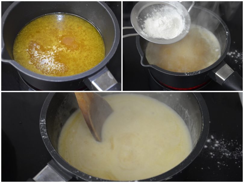 Nel frattempo preparate la salsa: versate il fondo di cottura dell'arrosto, rimasto nella teglia, in un pentolino, aggiungete la panna e portate a ebollizione, quindi unite lentamente la farina setacciandola con un colino.