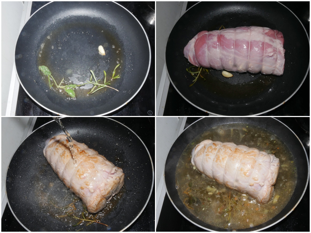 Aggiungete la carne (dopo averla ben legata: qui la guida per vedere come fare) e fatela rosolare per bene su tutti i lati per sigillare i succhi all'interno, quindi sfumate con il vino bianco e, una volta evaporato, aggiungete acqua (o brodo, va bene sia vegetale che di carne) fino a coprire metà della carne e cuocete a fuoco dolce per 1 ora: a metà cottura aggiustate di sale e pepe e girate la carne.