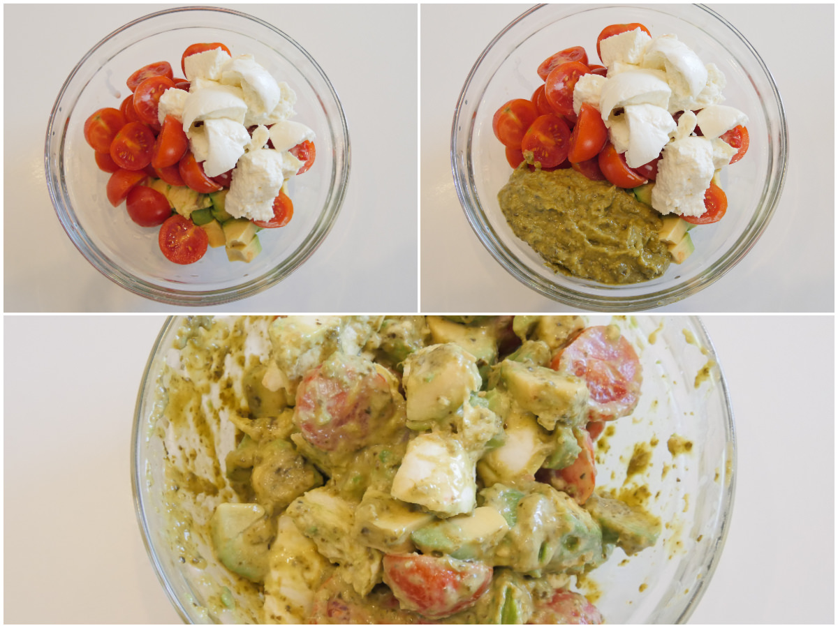 Unite quindi gli ingredienti (pomodori, mozzarella, avocado e pesto) in una ciotola, mescolate, aggiustate di sale se necessario (dipende dal pesto che usate e dal vostro gusto personale) e fate riposare in frigo per 1 ora.