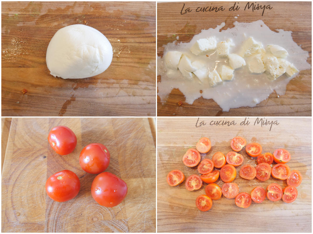 Innanzitutto tagliate la mozzarella a dadini e lasciatela sgocciolare, quindi lavate i pomodorini e tagliateli a metà (o in 4, se sono un po' più grandi)
