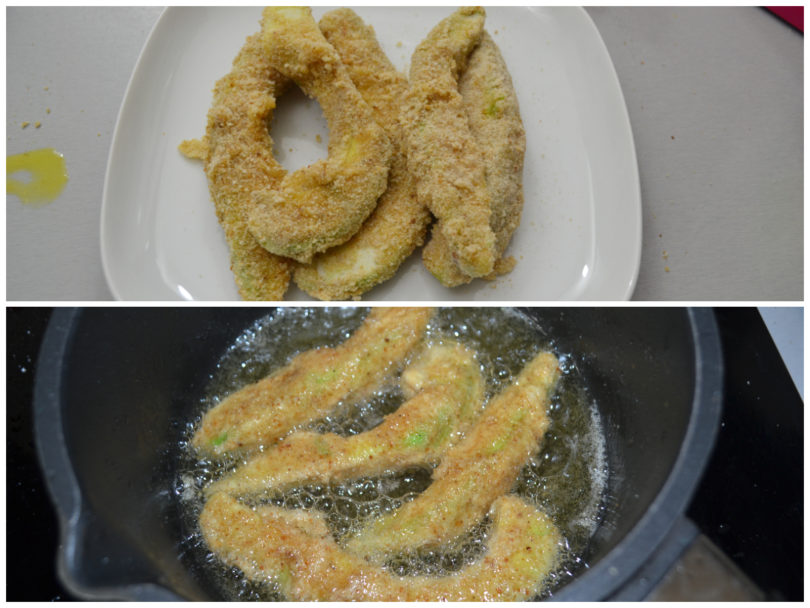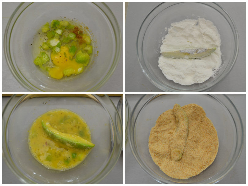 Passate i bastoncini di avocado prima nella farina, poi nelle uova e nel pangrattato. Poi di nuovo nelle uova e pangrattato ottenendo così una doppia panatura.