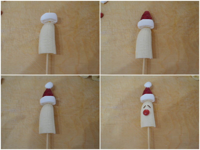 Impilate 1 pezzo di banana, 1 marshmallow e 1 lampone su uno spiedino, quindi aggiungete un pezzetto del marshmallow tagliato per creare il pon pon.