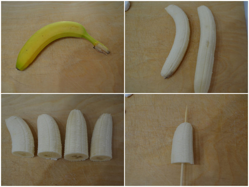 Poggiate quindi sulla banana codette e m&m's per creare il viso.