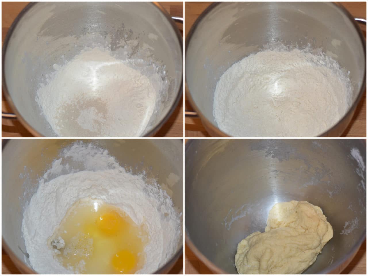 Mettete in una ciotola la farina setacciata e il lievito e mescolate, poi unite al centro zucchero, vaniglia, sale, uova e acqua e iniziate a impastare.