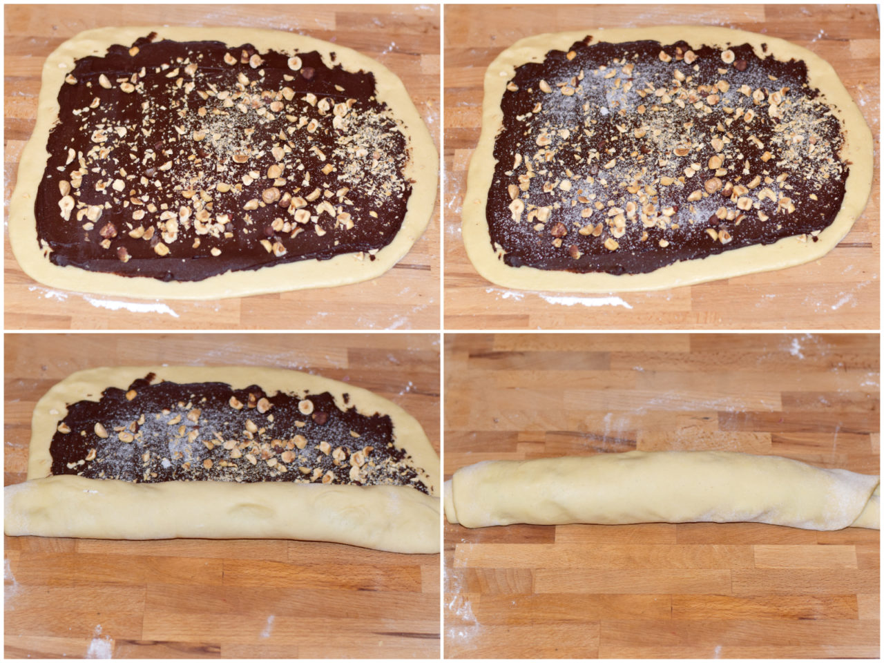 Spalmate tutta la superficie con la crema, lasciando liberi solo 1-2 cm lungo i bordi, cospargete con nocciole e zucchero e arrotolate partendo dal lato lungo.