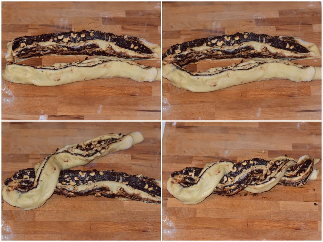 Con un coltello affilato, tagliate il rotolo a metà per il lungo, quindi intrecciate tra di loro le 2 metà, cercando di mantenere le parti tagliate verso l'alto.