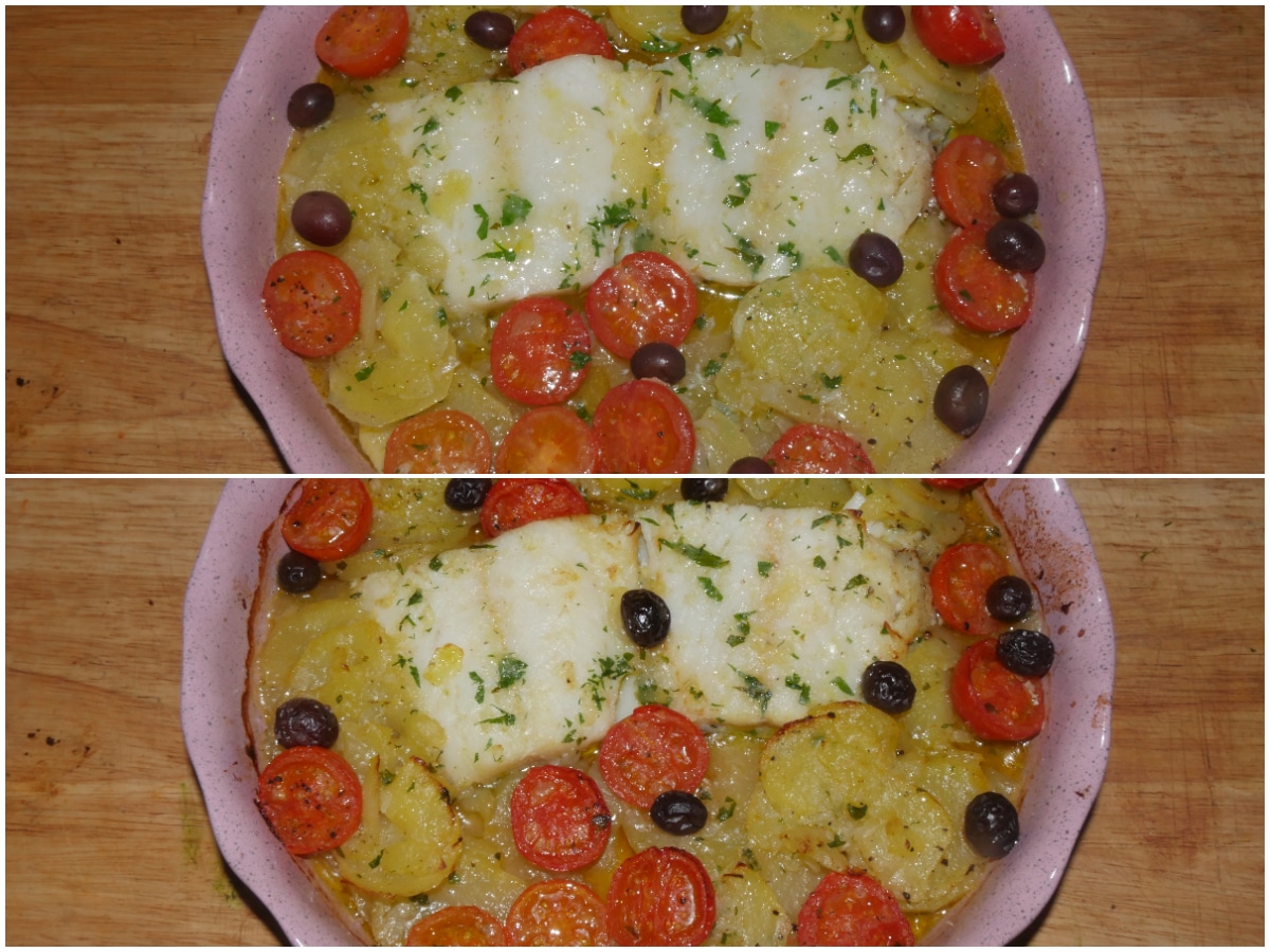 Trasferite il tutto in una pirofila adatta per la cottura in forno (se il sughetto vi sembra troppo non mettetelo tutto, tenetelo da parte e aggiungetelo poi solo se necessario), unite anche le olive (meglio se denocciolate, in modo da non trovarvi con fastidiosi nocciolini in giro per il piatto o peggio ancora sotto ai denti), aggiustate di sale se necessario (ricordate che il baccalà è già salato di suo) e cuocete per circa 20 minuti a 200°C, in forno ventilato già caldo.