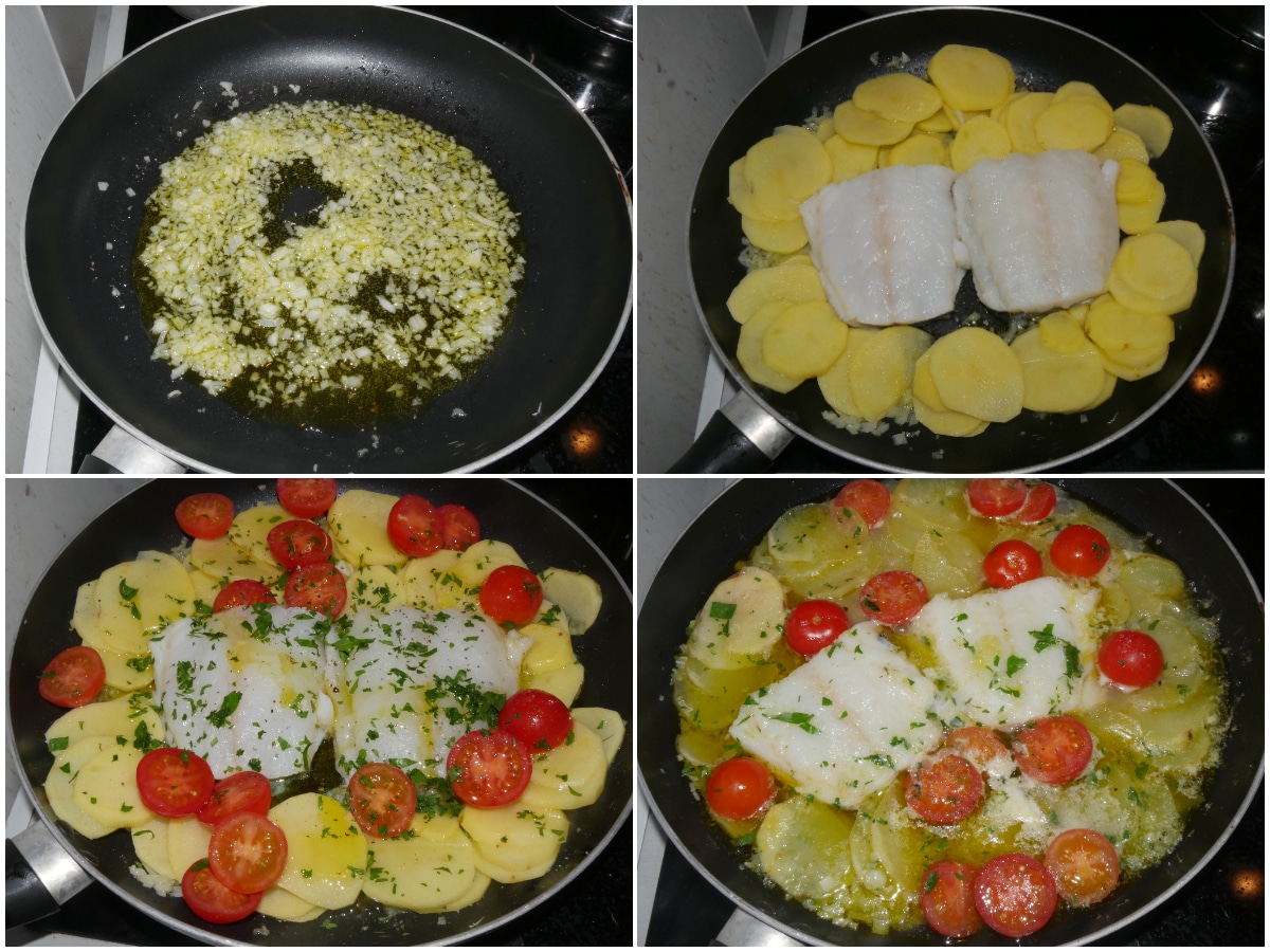 Preparate un trito si cipolla e fate appassire in una casseruola con olio abbondante, quindi unite le patate, il baccalà, i pomodorini e l'acqua, chiudete parzialmente con un coperchio e lasciate stufare a fiamma media per circa 15 minuti.
