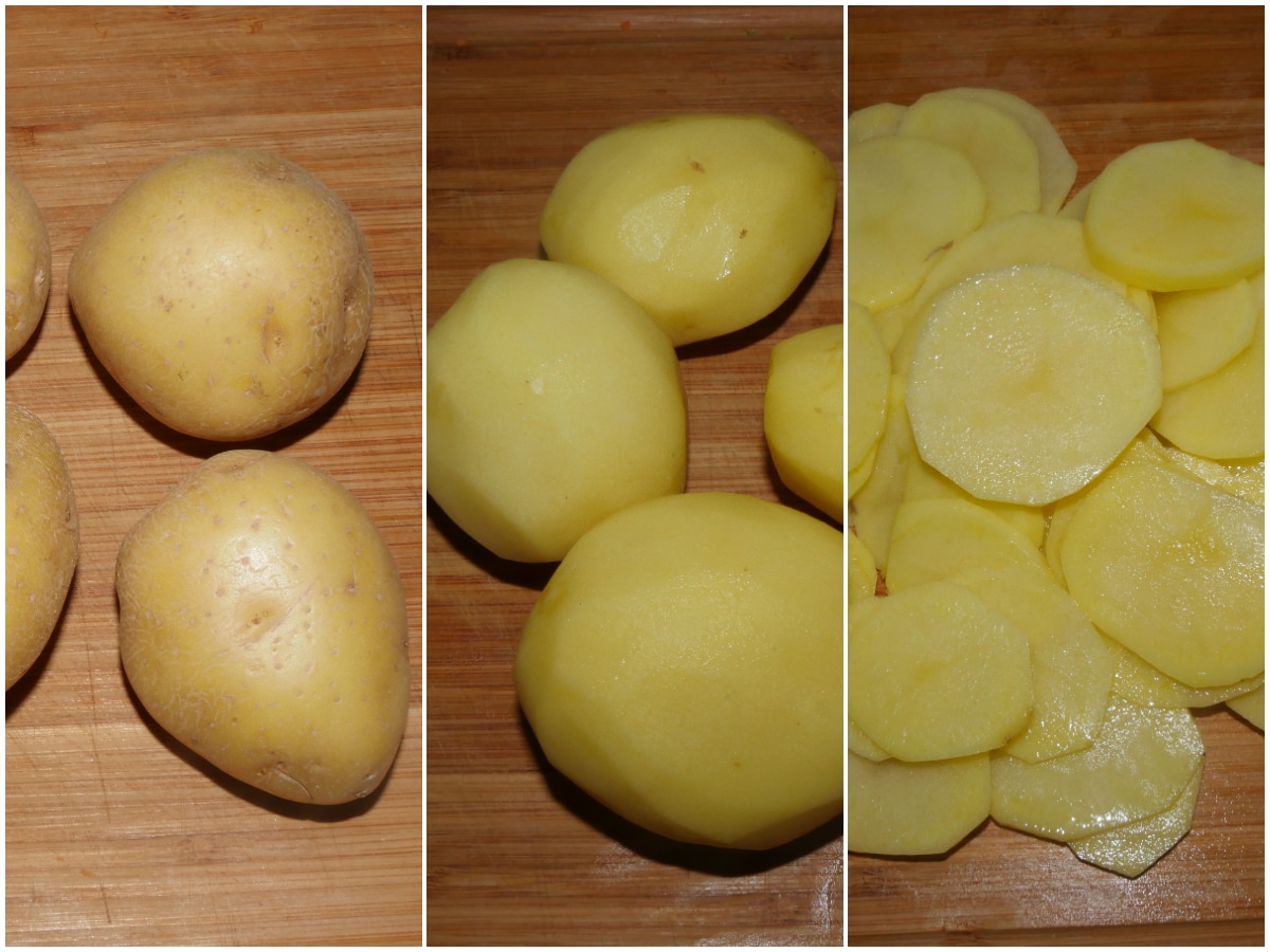 Una volta pronto il baccalà, iniziate a preparare il piatto: pelate le patate, lavatele e tagliatele a rondelle abbastanza sottili.