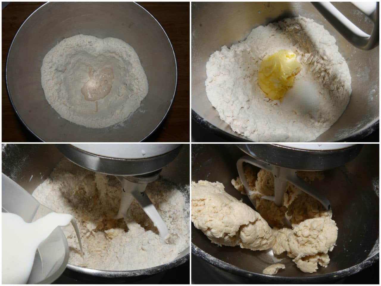 A questo punto iniziate a preparare l'impasto: mettete la farina a fontana in una ciotola, versate al centro il lievito sciolto e iniziate a mescolare, poi aggiungete burro e zucchero e quindi il latte.