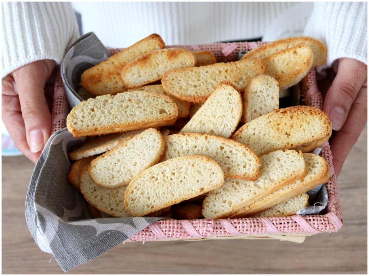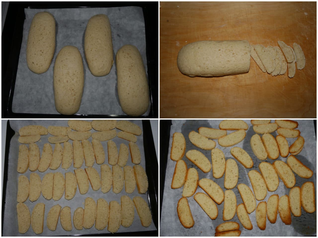Tagliateli quindi a fettine molto sottili (3-4 mm circa), disponetele nuovamente sulla teglia senza farle accavallare tra di loro e lasciatele tostare per qualche minuto in forno ventilato preriscaldato a 180°C, finché non iniziano a dorarsi.