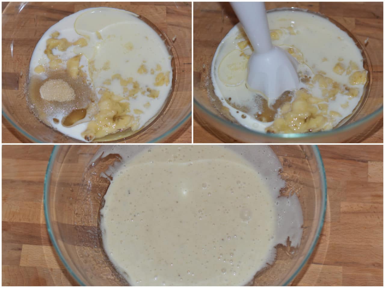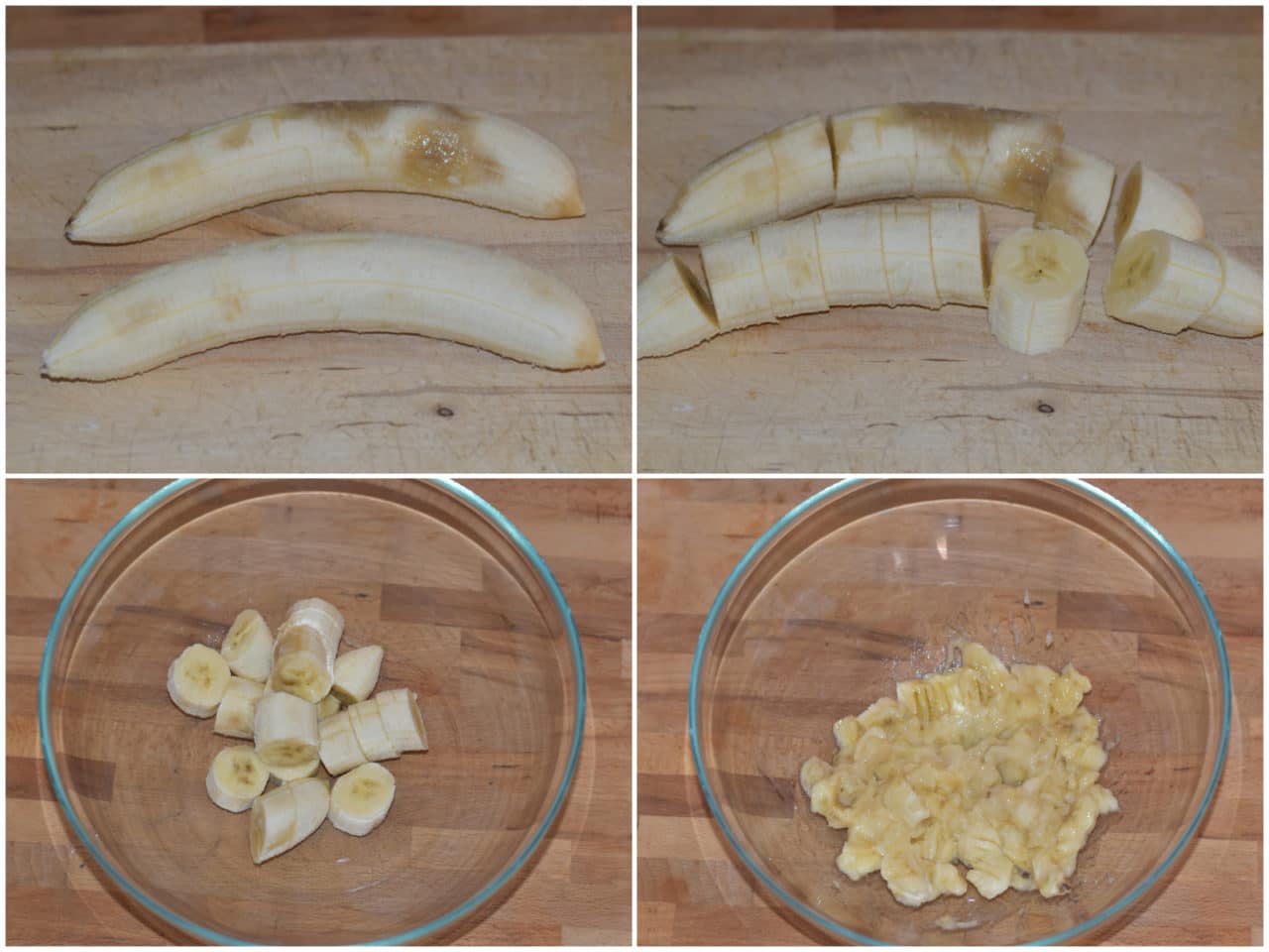 Innanzitutto sbucciate le banane, tagliatele a pezzi e schiacciatele con i rebbi di una forchetta.