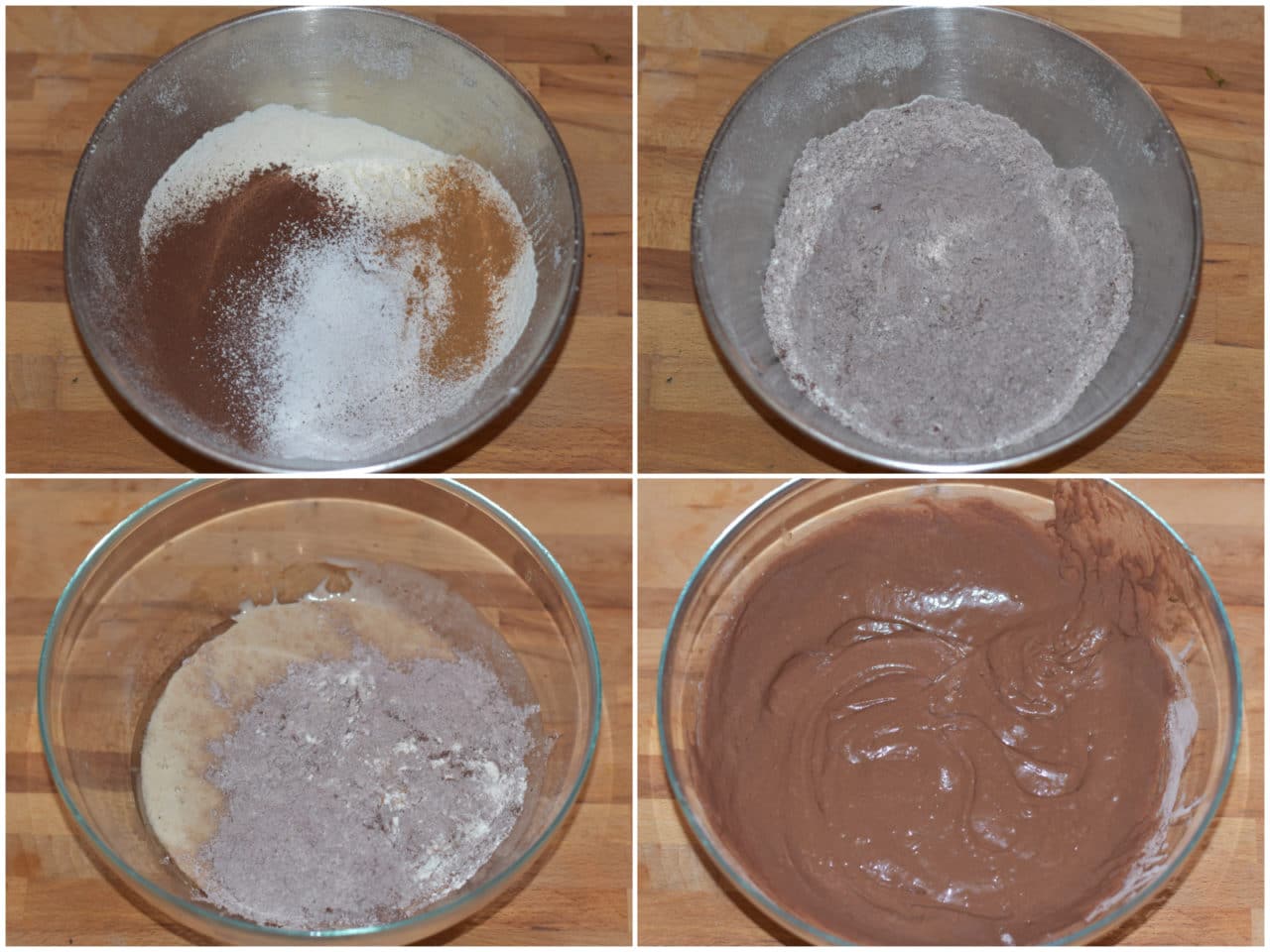 Setacciate farina, cacao, sale e cannella in una ciotola e uniteli tutti insieme, mescolando poi con una spatola.
