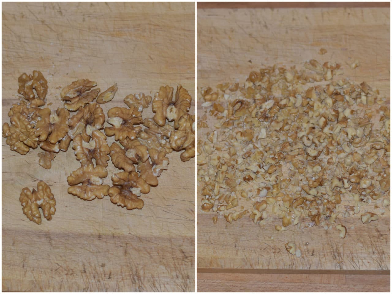Tritate grossolanamente le noci e incorporatele all'impasto, lasciandone qualcuna da parte per la decorazione.