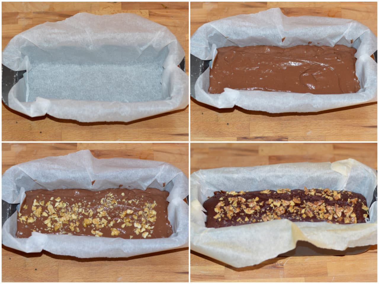Versate il composto nello stampo rivestito di carta forno, decorate con le noci rimaste e cuocete per 30-40 minuti a 180°C, in forno statico già caldo.