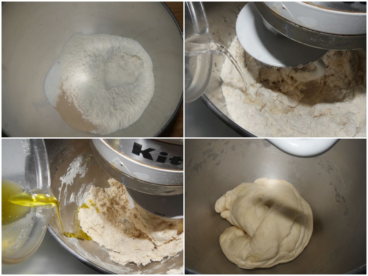 Preparate l'impasto: mettete in una ciotola farina, lievito e zucchero e mescolate, quindi unite prima l'acqua e poi sale e olio, lavorando fino ad ottenere un impasto morbido ed elastico, che si stacca dalle pareti.