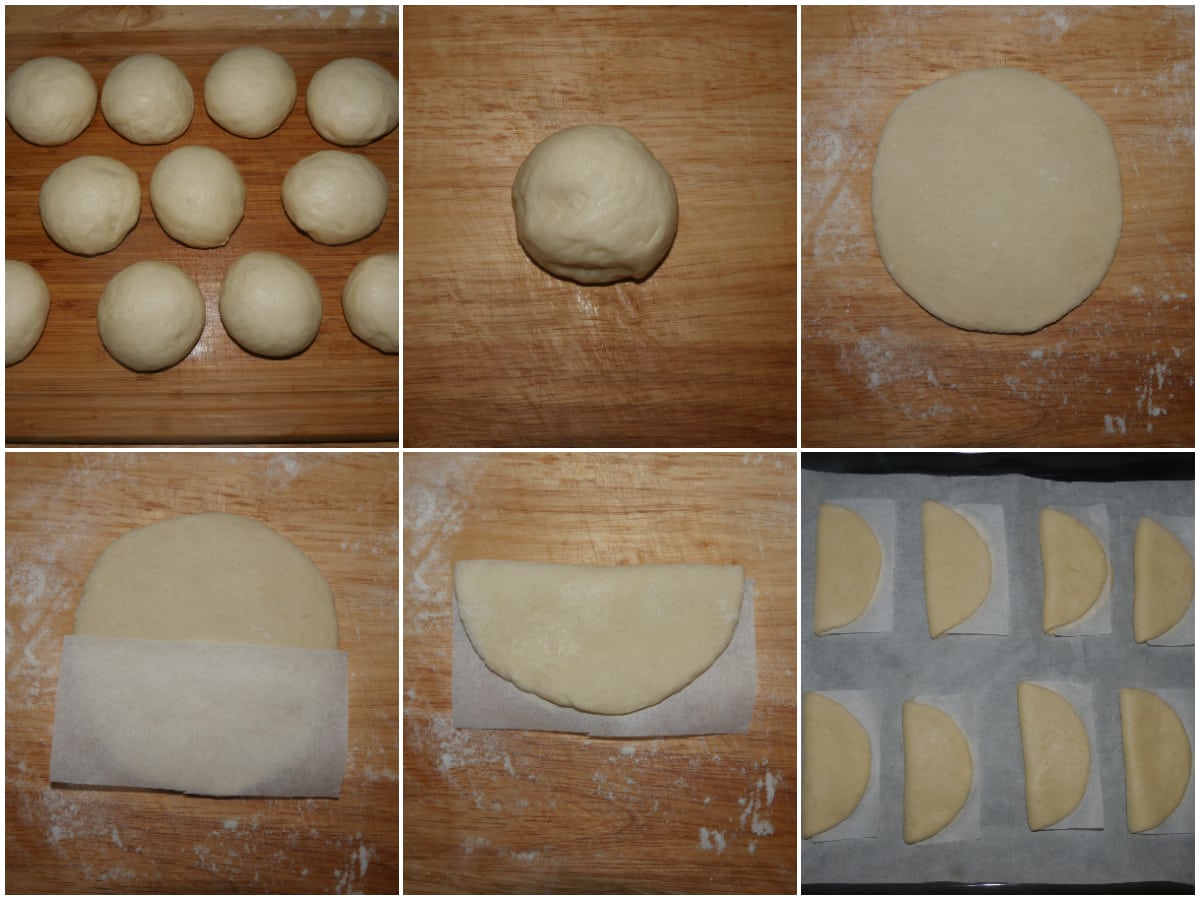 Prendete una pallina per volta, stendetela in una sfoglia circolare con un matterello, copritene metà con un pezzetto di carta forno e richiudete l'impasto a mezzaluna.