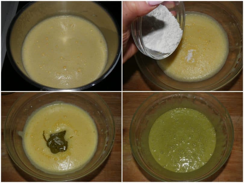 Incorporate la gelatina, che io ho usato al posto della gelatina (se usate la colla di pesce ricordatevi di lasciarla a bagno in acqua fredda per almeno 10 minuti e di strizzarla delicatamente prima di incorporarla) e mescolate per farla sciogliere bene, quindi incorporate anche la pasta di pistacchio.