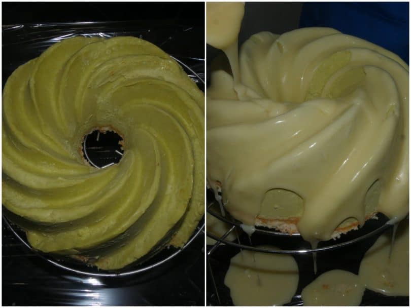 Riprendete la torta, toglietela delicatamente dallo stampo e poggiatela su una gratella per dolci (con il pan di Spagna verso il basso).
