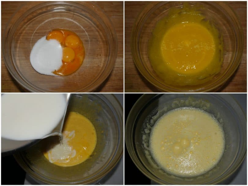 Preparate la crema bavarese: scaldate il latte in un pentolino (o nel microonde) e nel frattempo montate i tuorli con lo zucchero, quindi incorporate il latte caldo.
