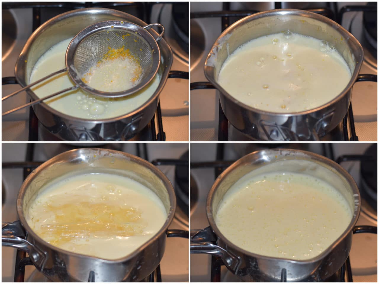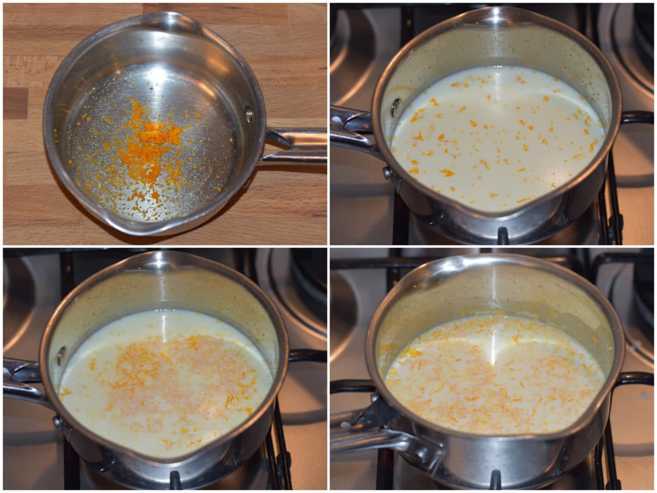 Mettete buccia di 1 arancia grattugiata e latte in un pentolino e portate a ebollizione, quindi spegnete e lasciate intiepidire.