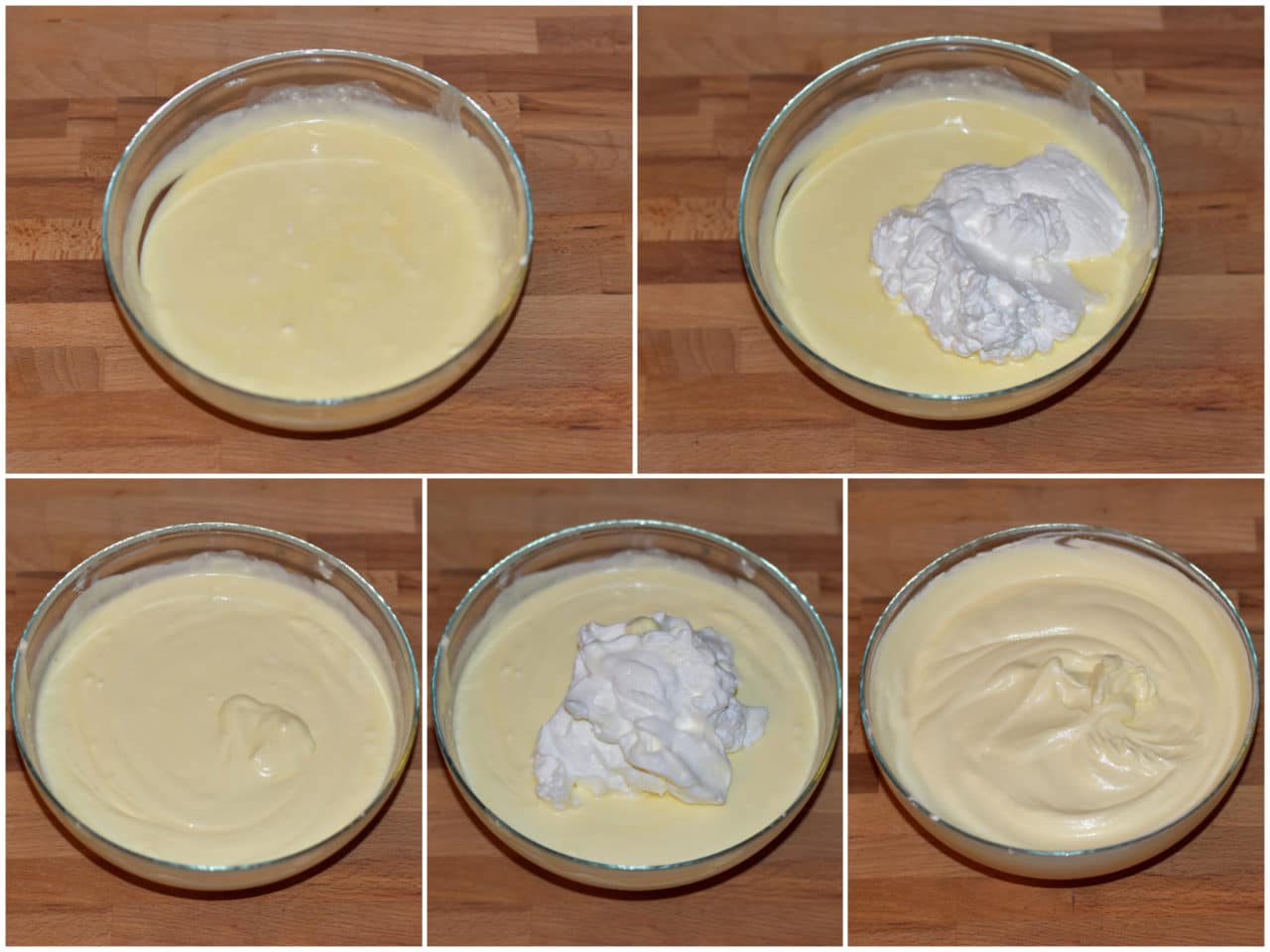 Montate la panna, ben fredda di frigo, e incorporatela al composto in 3-4 riprese, mescolando delicatamente con una spatola, con un movimento dal basso verso l'alto.