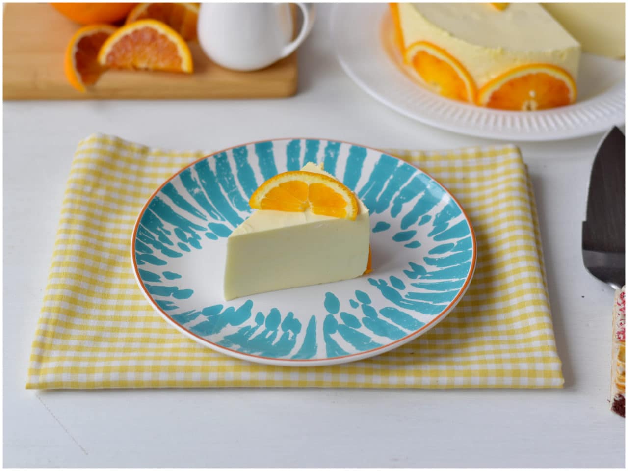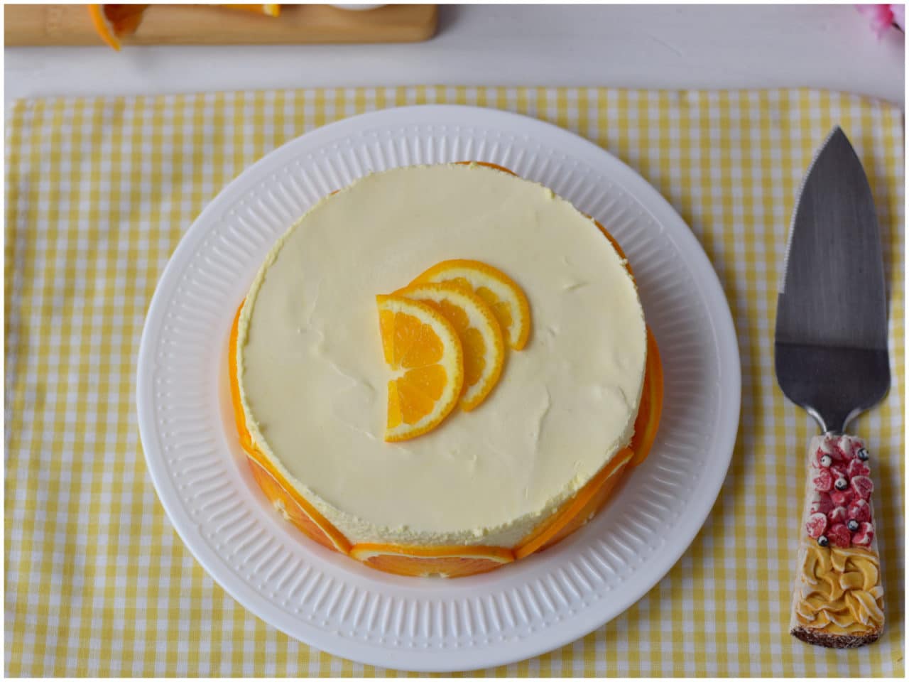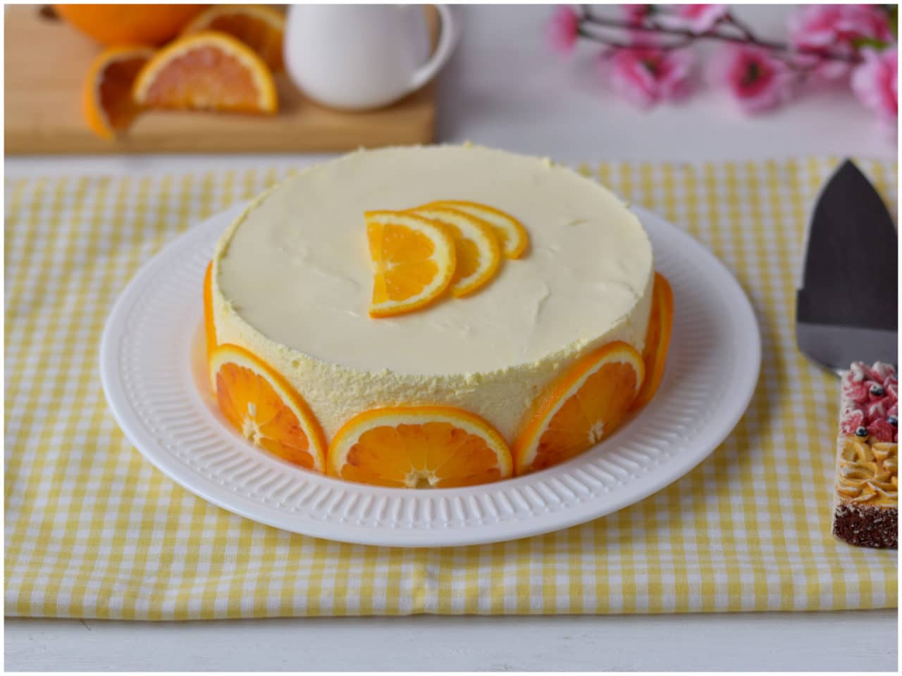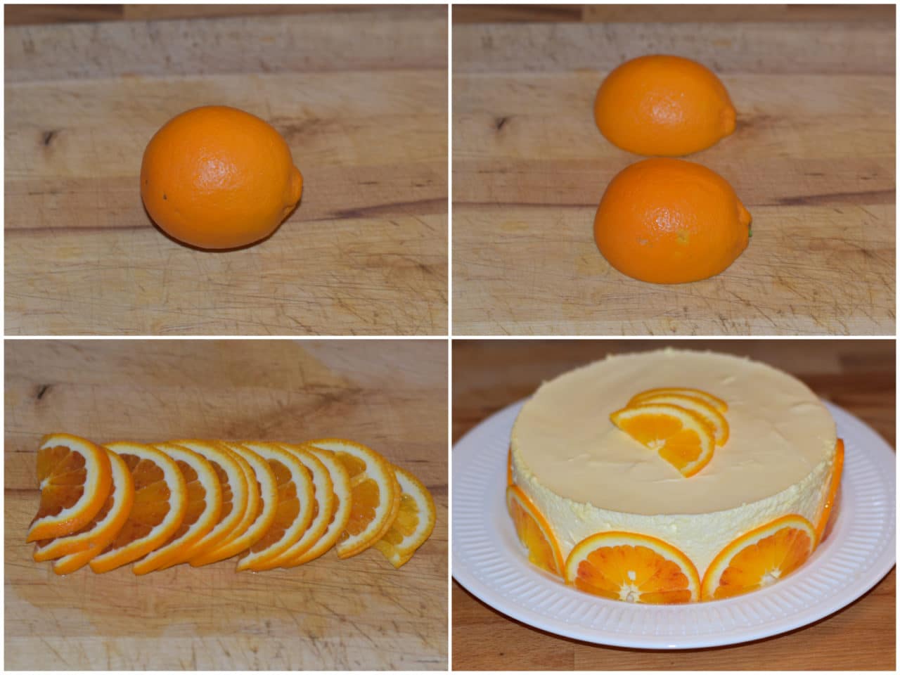 Lavate bene anche la seconda arancia, tagliatela a fettine molto sottili e usatela per decorare il dolce.