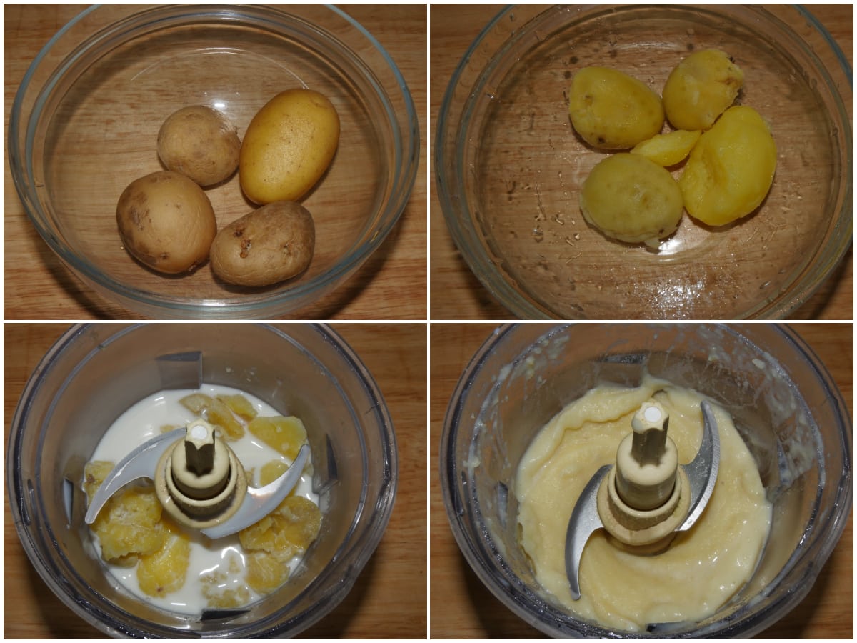 Innanzitutto lavate le patate, bucherellatele con i rebbi di una forchetta e cuocetele in microonde per circa 5 minuti o finché non risulteranno morbide (dipende dalle dimensioni delle patate), quindi pelatele e frullatele con il latte.