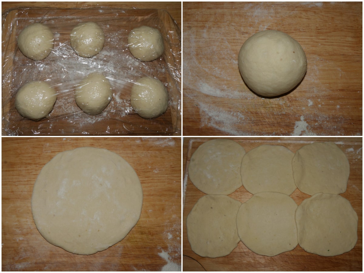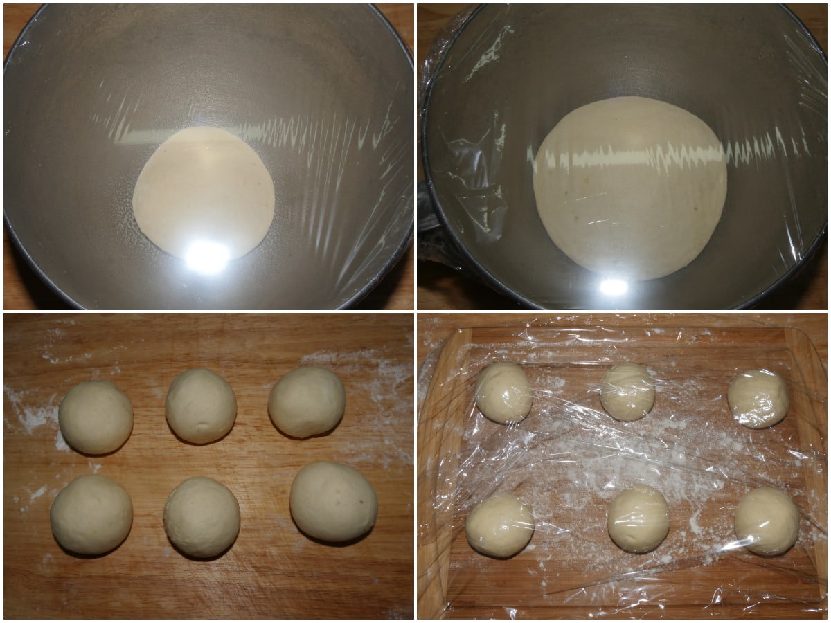 Coprite la ciotola con pellicola per alimenti e lasciate lievitare per almeno 1 ora o fino al raddoppio, quindi dividetelo in 6 palline uguali, copritele con pellicola e lasciatele riposare per 30 minuti.