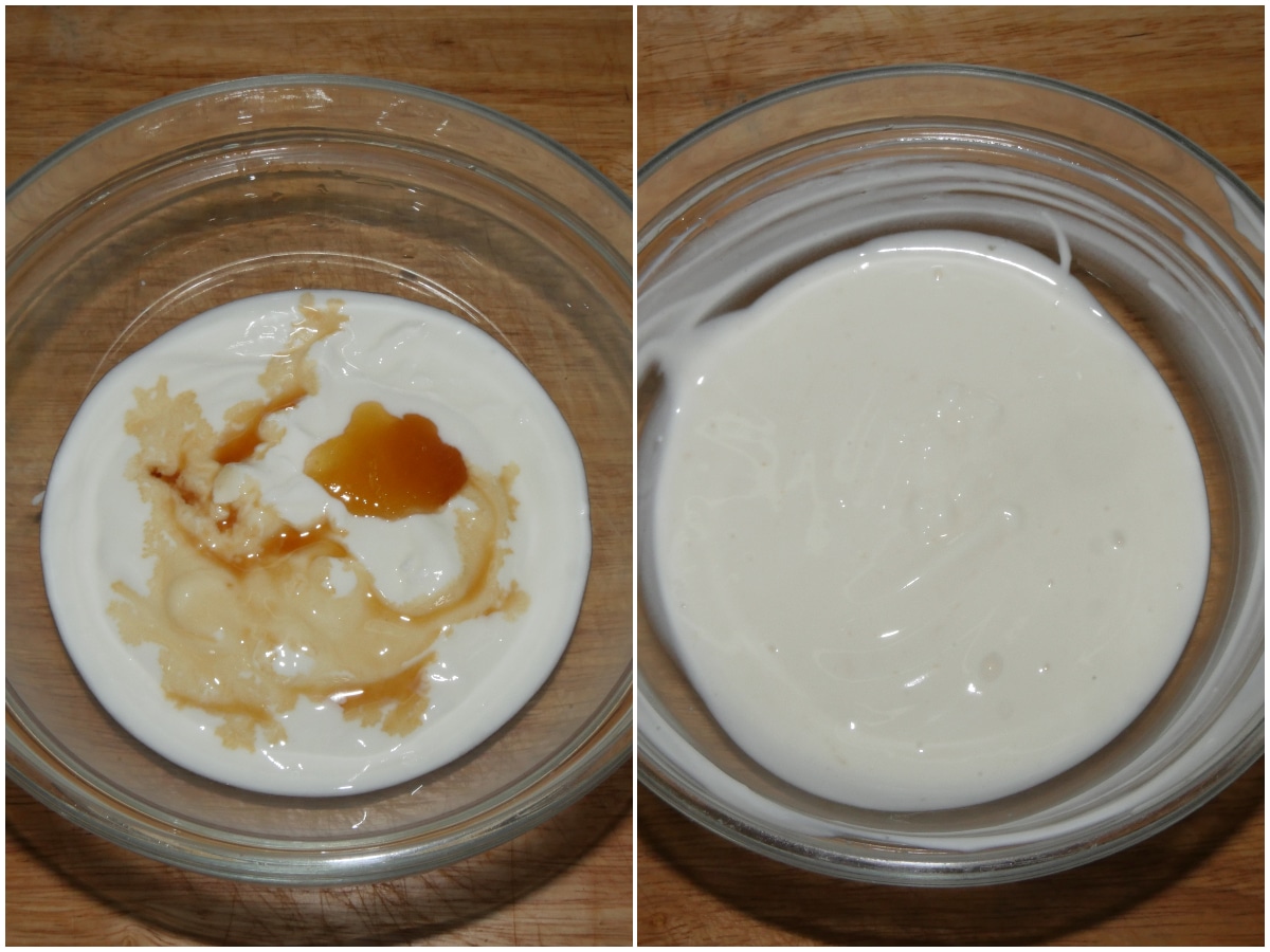 Mettete lo yogurt in una ciotola, aggiungete miele e vaniglia e amalgamate.