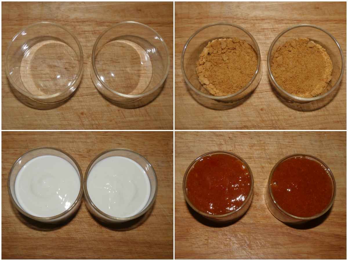 Componete i bicchierini: mettete sul fondo i biscotti sbriciolati, create uno strato di yogurt e completate con la purea di cachi.