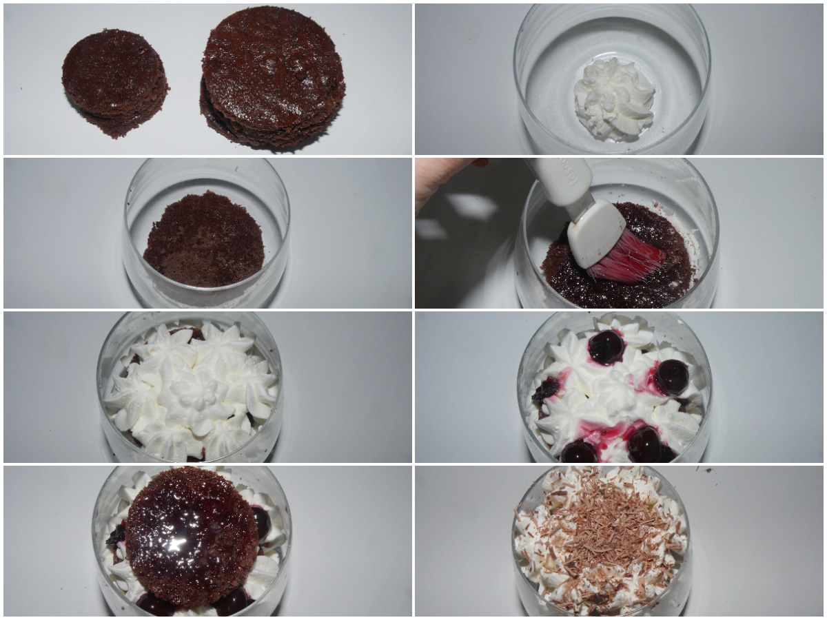 Assemblate i dolcetti: create un ciuffetto di panna sul fondo dei bicchierini, posizionate il primo disco di pan di Spagna sulla panna e spennellatelo con la bagna, quindi aggiungete uno strato di panna e qualche amarena, poi ripetete (pan di spagna, bagna, panna, amarene) e completate con un terzo dischetto, la bagna e la panna, aggiungendo un decoro con scagliette di cioccolato sopra la panna prima di completare con una singola amarena.