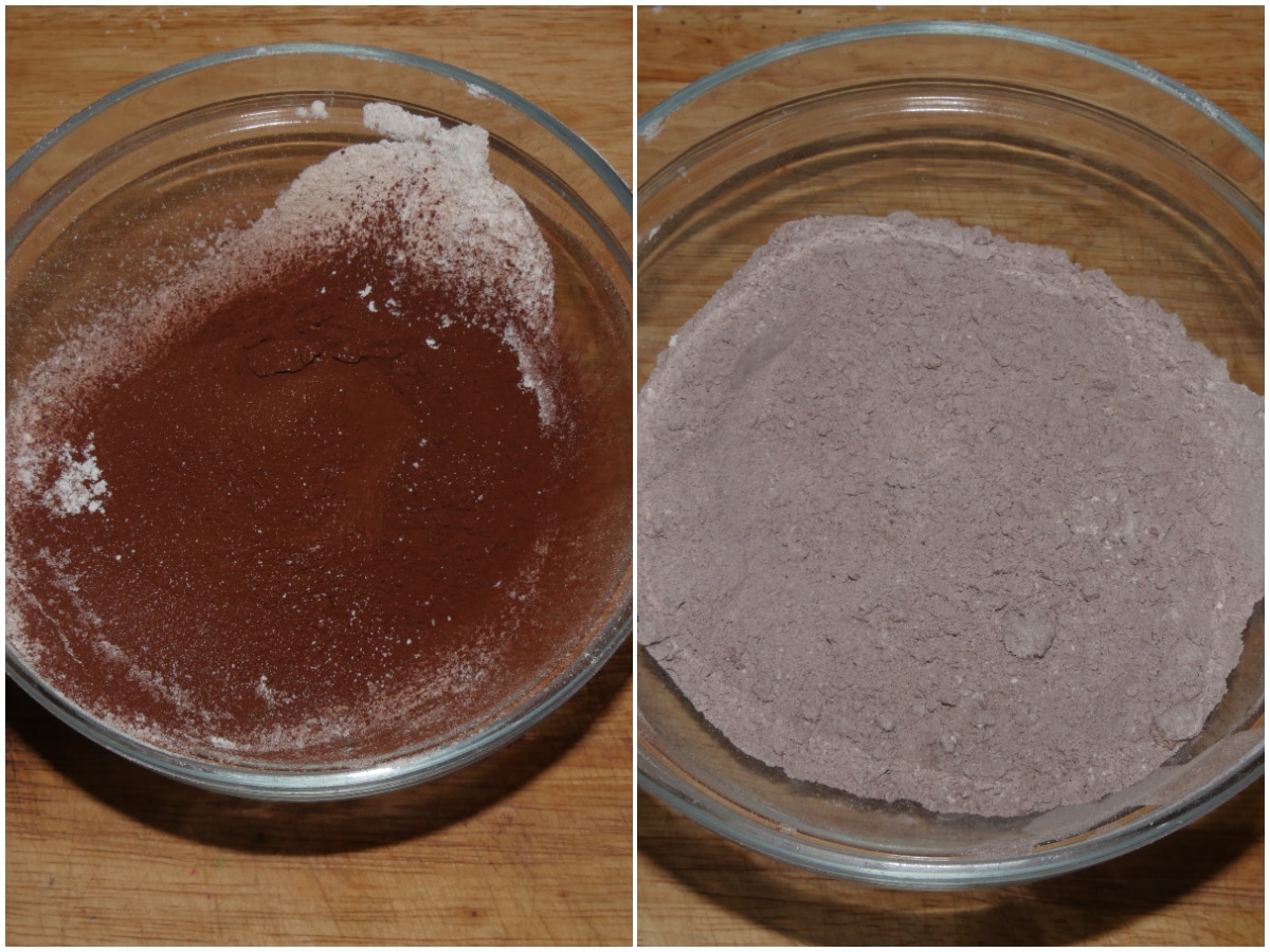 Unite tutte le polveri (farina, cacao, sale) in una ciotola e mescolate.