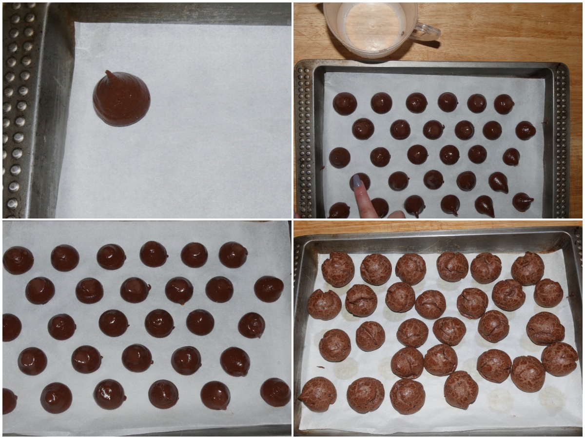 Col dito bagnato, appiattite la puntina lasciata in cima dalla sac-à-poche, quindi cuocete per 10 minuti a 190°C, in forno ventilato già caldo, poi abbassate la temperatura a 170°C e cuocete per altri 30 minuti.