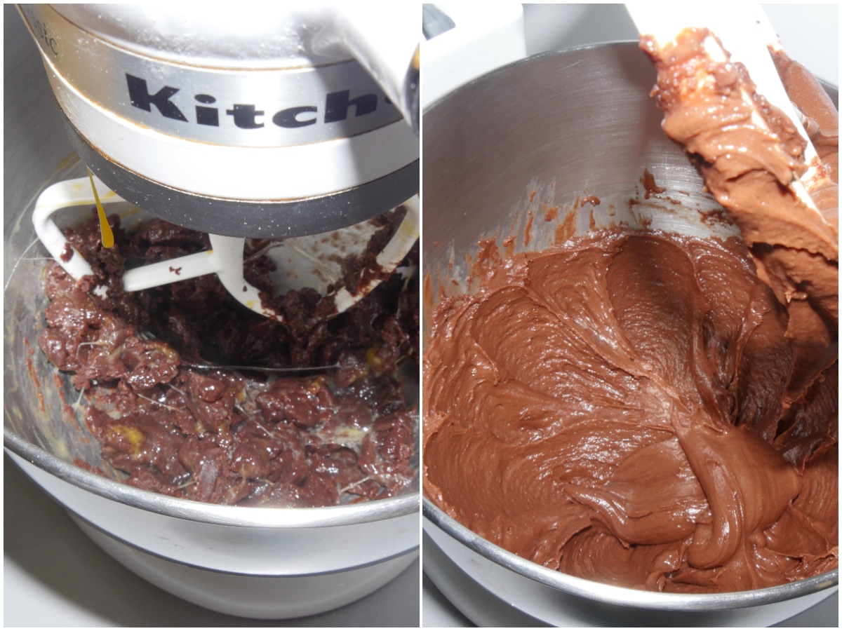 Trasferite in una ciotola fredda e continuate a mescolare finché non sarà appena tiepido, quindi iniziate a incorporare le uova, 1 per volta, aspettando che il precedente sia stato completamente assorbito prima di aggiungere il successivo.