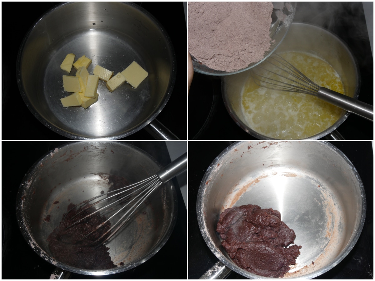 Fate sciogliere il burro a tocchetti in una casseruola con l'acqua, quindi aggiungete le polveri tutte insieme e mescolate finché il composto non diventerà molto sodo e inizierà a staccarsi da fondo e pareti, quindi togliete dal fuoco.