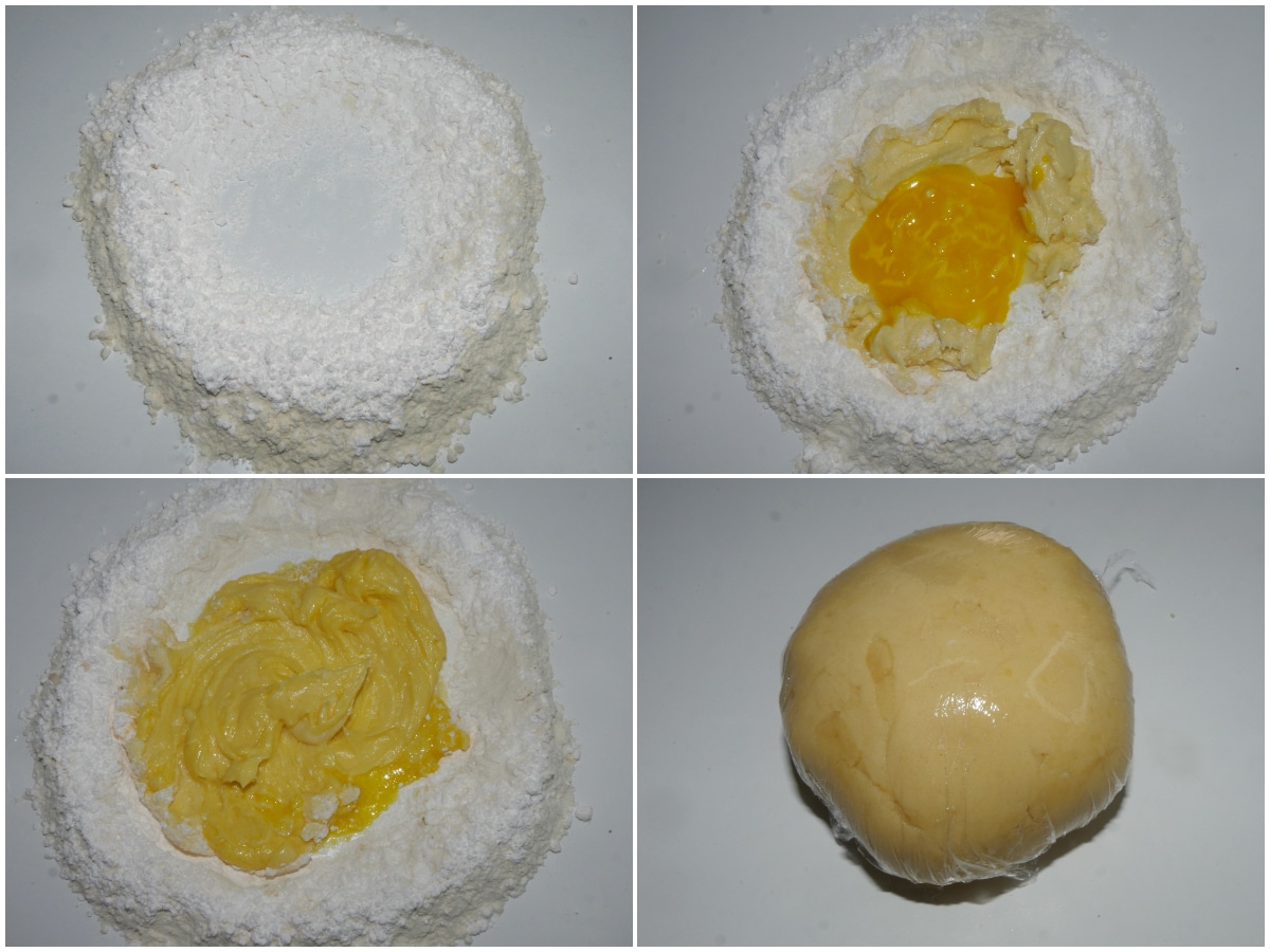 Mettete zucchero a velo, farina e lievito a fontana in una ciotola o sul piano di lavoro, aggiungete al centro burro morbido, tuorlo e vaniglia e lavorate velocemente fino ad ottenere un panetto omogeneo.