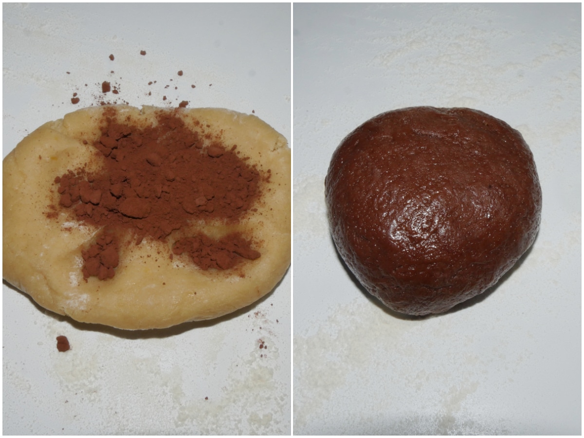 Aggiungete il cacao e metà albume all'altra metà e lavorate velocemente fino ad ottenere un colore omogeneo, quindi avvolgete anche questo con pellicola e lasciate riposare tutto in frigo per almeno 1 ora.