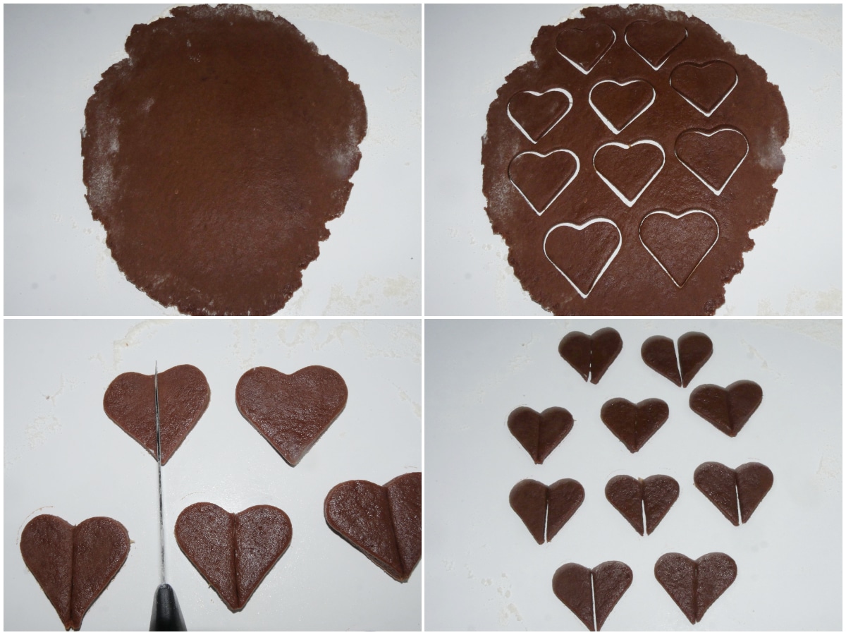 Stendete anche la sfoglia scura, create anche qui dei cuori (ve ne serviranno lo stesso numero) e divideteli a metà.
