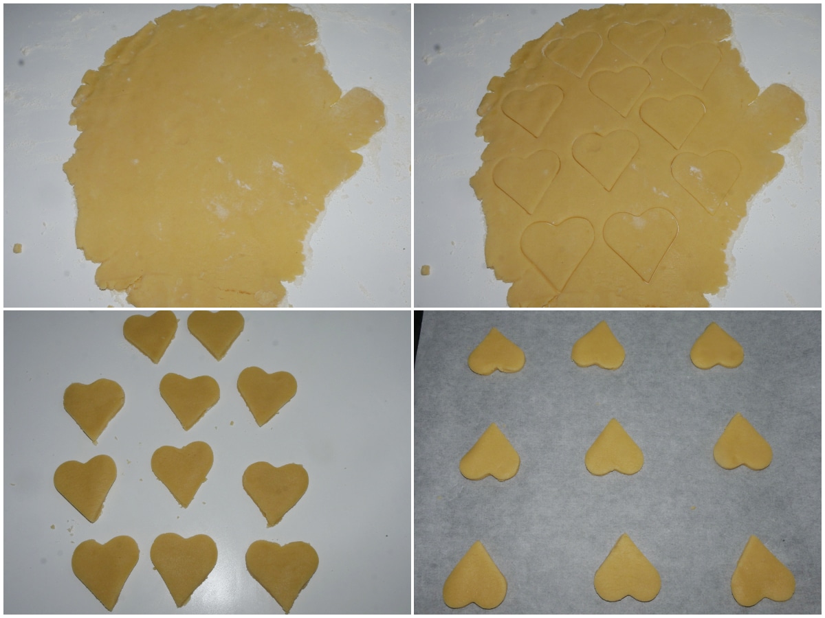 Riprendete la frolla chiara, stendetela in una sfoglia col matterello e ricavate con la formina tanti cuori che andrete a disporre sulla teglia rivestita di carta forno, con la punta verso l'alto e ben separati tra di loro: saranno i musetti dei vostri cagnolini.
