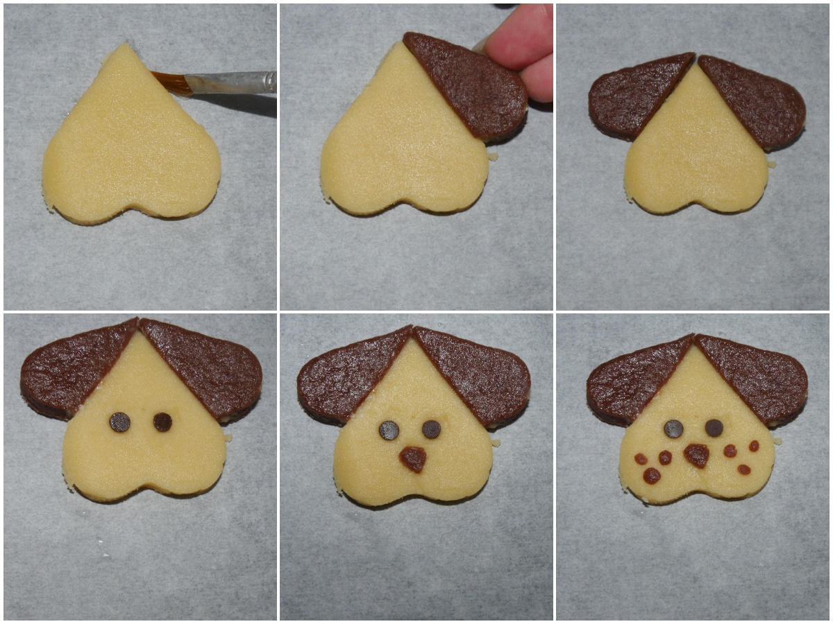 Spennellate poco albume lungo i lati ad angolo del cuore chiaro e attaccate le parti scure, che saranno le orecchie dei cani.