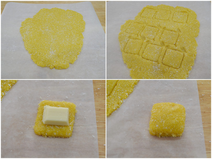 mettete al centro di metà delle formine un cubetto di cioccolato bianco, quindi coprite con un altro quadratino di sfoglia e sigillate bene i bordi.