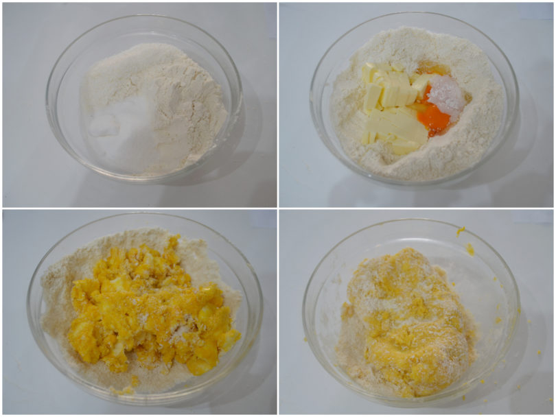 Innanzitutto preparate la pasta frolla al cocco: unite le due farine in una ciotola, mettete al centro uova, burro, zucchero e lievito e lavorate rapidamente fino ad ottenere un panetto omogeneo, quindi avvolgete con pellicola da cucina e lasciate riposare per almeno 1 ora in frigo.