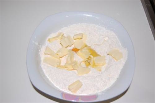 In una ciotola abbastanza capiente mescolate la farina, lo zucchero a velo, la vanillina, il lievito, l'uovo e il burro ammorbidito a tocchetti.