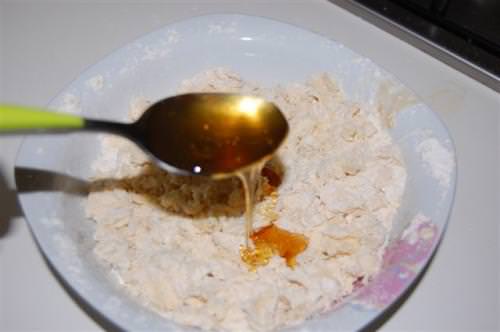 Iniziare a lavorare gli ingredienti con la punta delle dita fino a formare un composto granuloso. Aggiungere 2 cucchiai di miele e lavorare l'impasto fino a formare un panetto omogeneo.